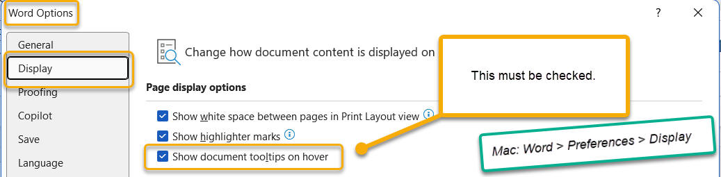 - Both require that your Word option/preference is set to show document tooltips on hover (screenshot below).