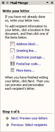 2.         From the Tools menu, choose Letters and Mailings and Mail Merge Wizard to open the Mail Merge Task Pane.